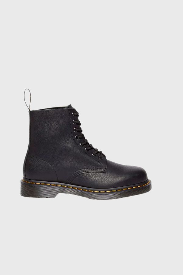 Κλασικό σχέδιο Dr. Martens με 8 μεταλλικές οπές, καμπύλες στα πλαϊνά και κίτρινες ραφές για στυλάτες εμφανίσεις παντού.