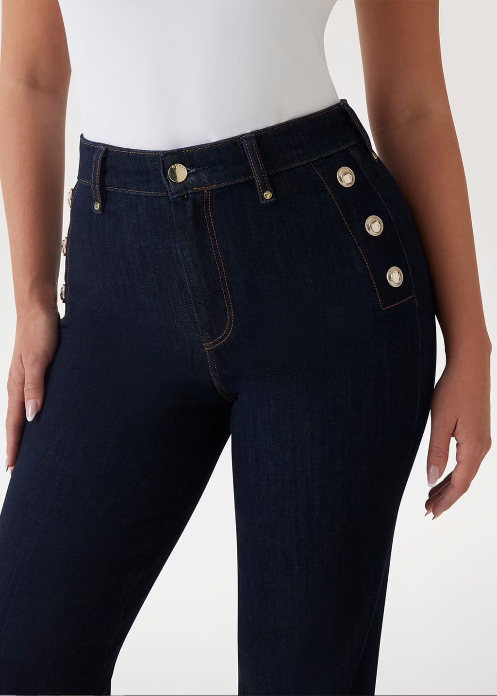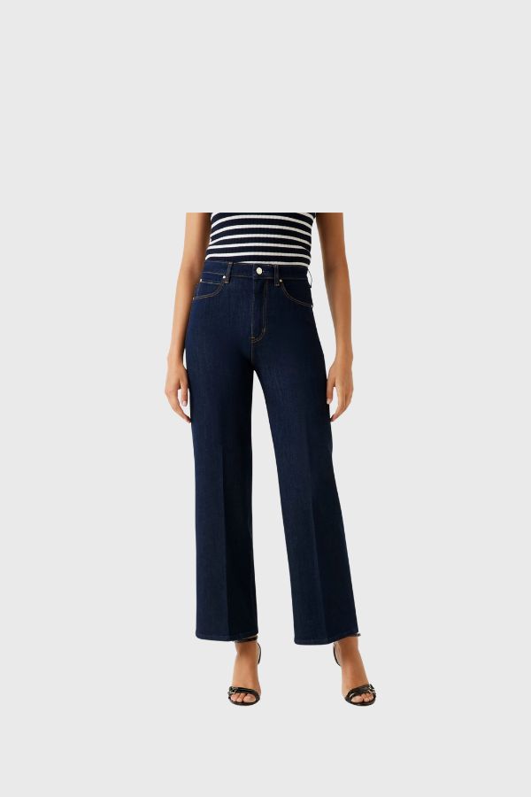 - Ελαστικό τζιν παντελόνι σε σκούρο χρώμα με φαρδιά μπατζάκια