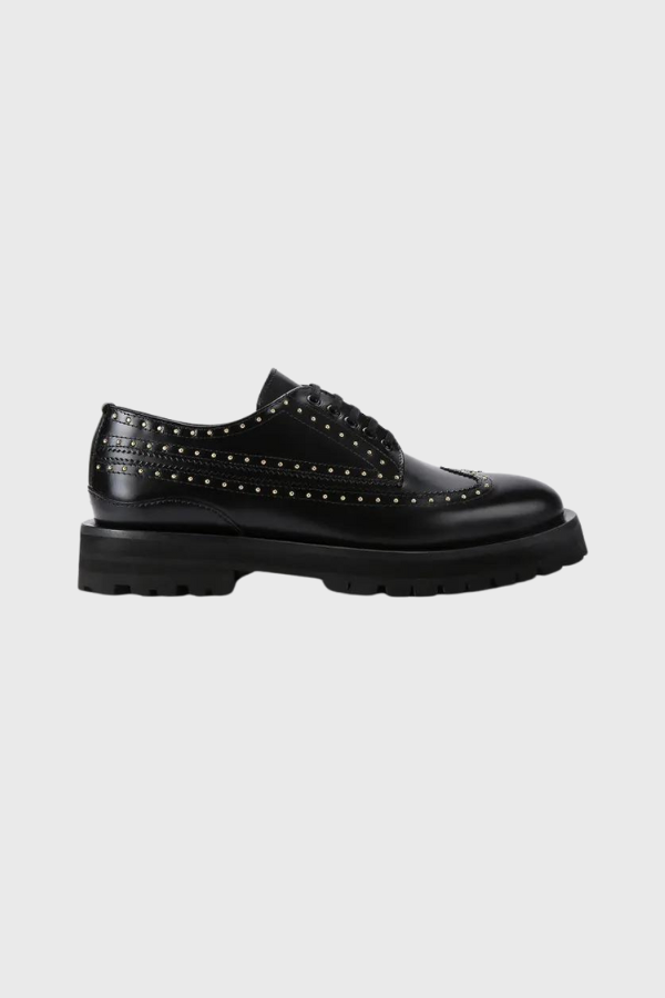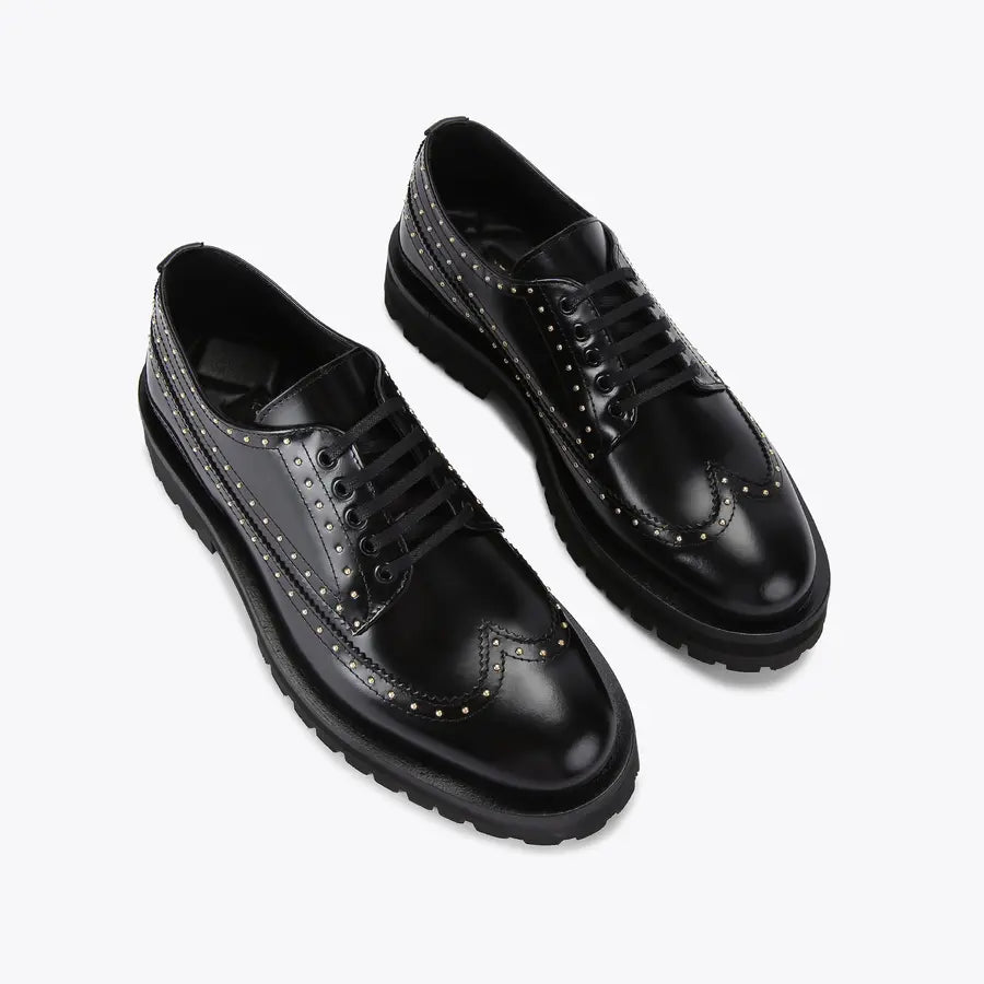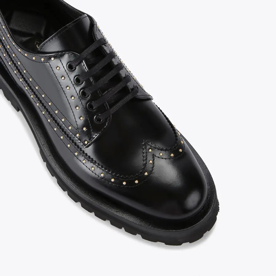 Το Drayton Stud είναι ένα μαύρο παπούτσι με χρυσές λεπτομέρειες και ραφές στο επάνω μέρος.