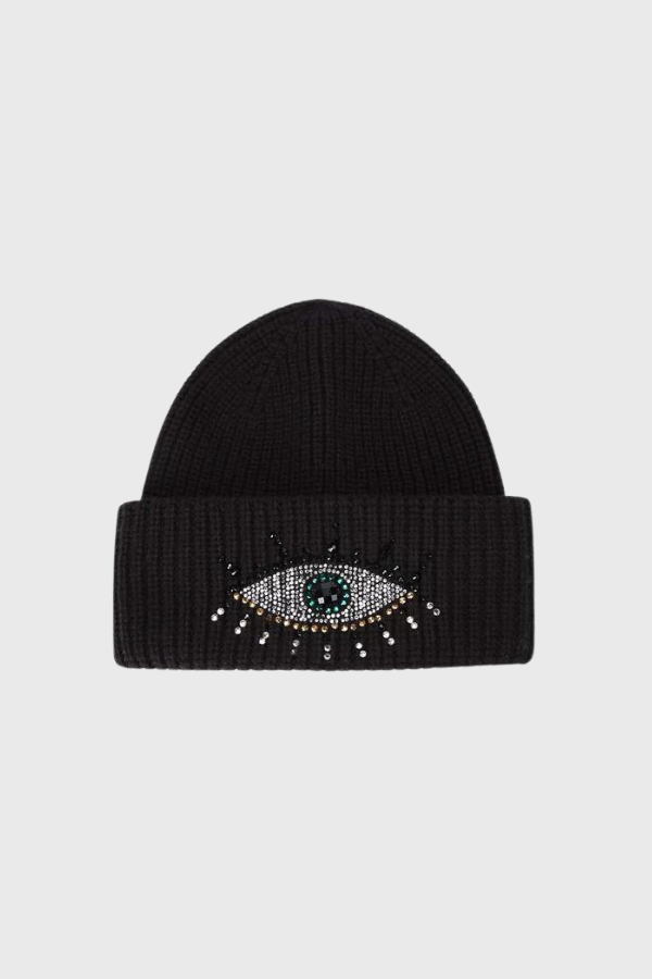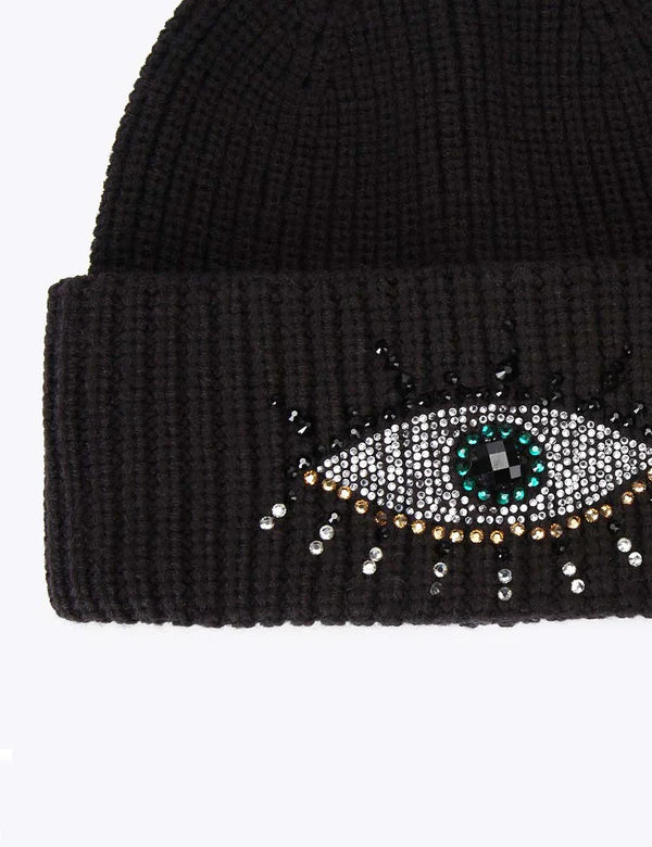 Πλεκτός σκούφος με ραβδώσεις και evil eye σχηματισμένο από κρύσταλλα στο μπροστινό μέρος.