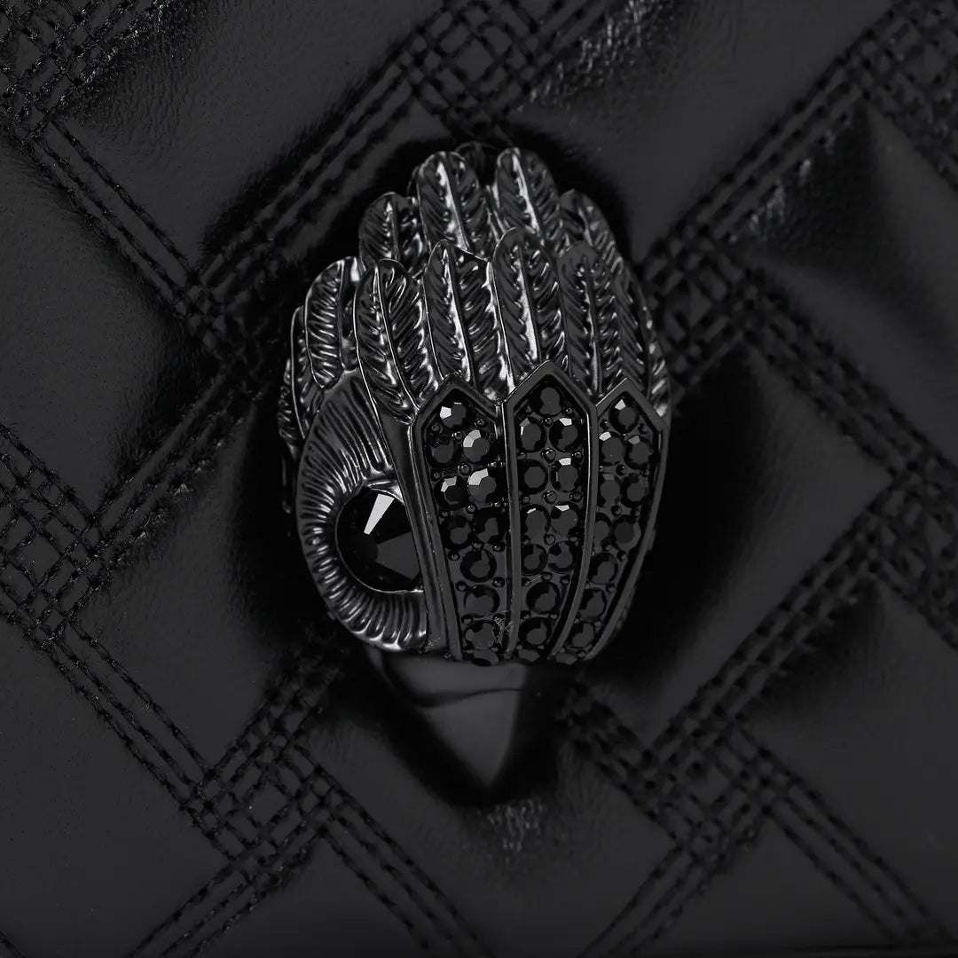 Αυτή η τσάντα Kensington Drench Puff Pouch διαθέτει μαύρο δερμάτινο εξωτερικό με μεγάλο σχέδιο καπιτονέ που είναι απαλά επενδεδυμένο. Στο μπροστινό μέρος της τσάντας υπάρχει ένα μεγάλο μαύρο κεφάλι αετού.