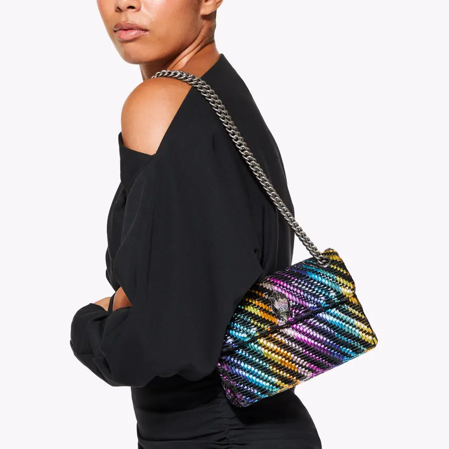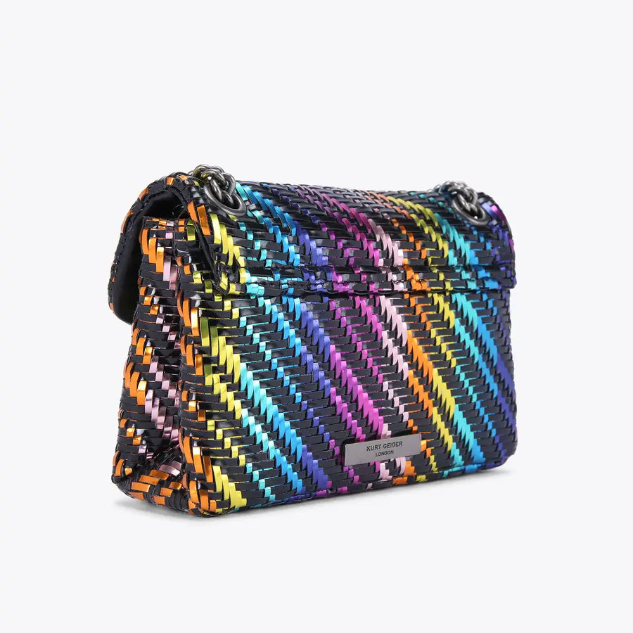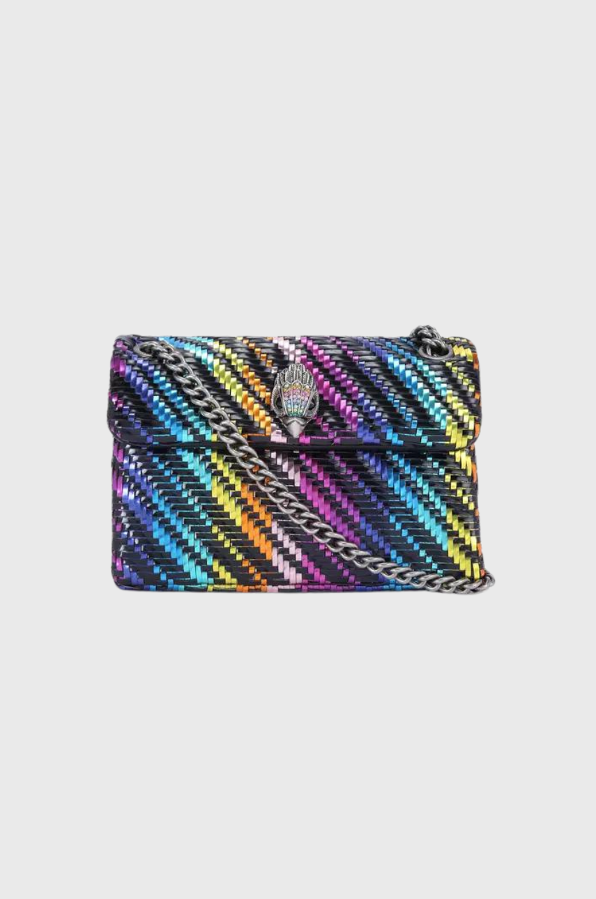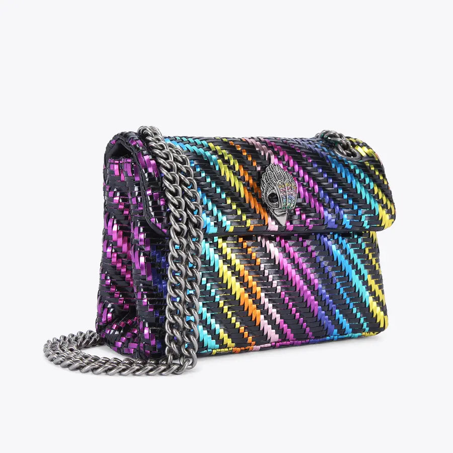 Η τσάντα Mini Kensington είναι κατασκευασμένη από μεταλλικό υφαντό ύφασμα με εφέ ρίγες ουράνιου τόξου.