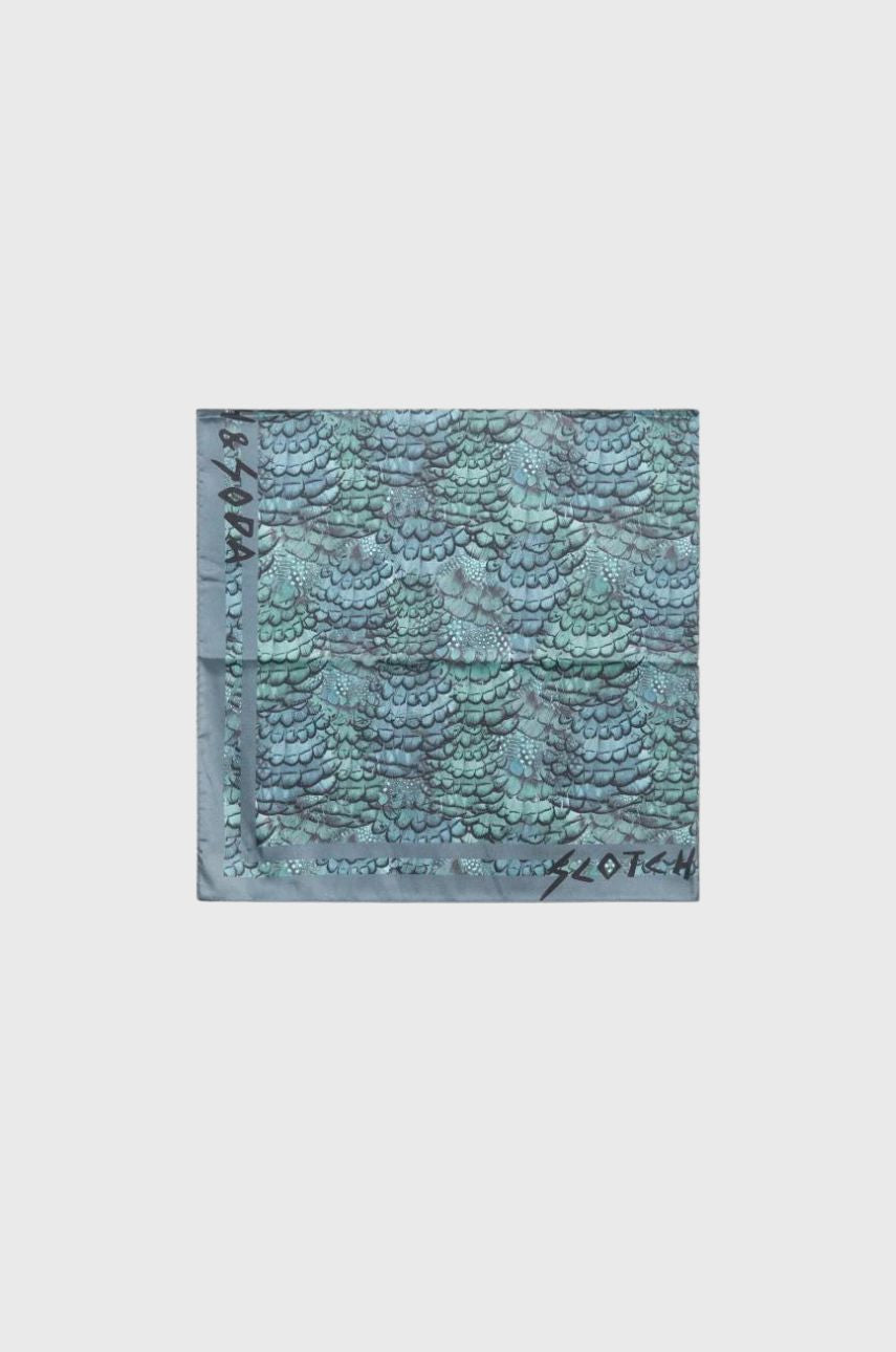 Φουλάρι από την εταιρεία Scotch & Soda σε τιρκουάζ χρώμα με μοτίβο. Είναι κατασκευασμένο από ανακυκλωμένο πολυεστέρα και έχει τυπωμένο λογότυπο.