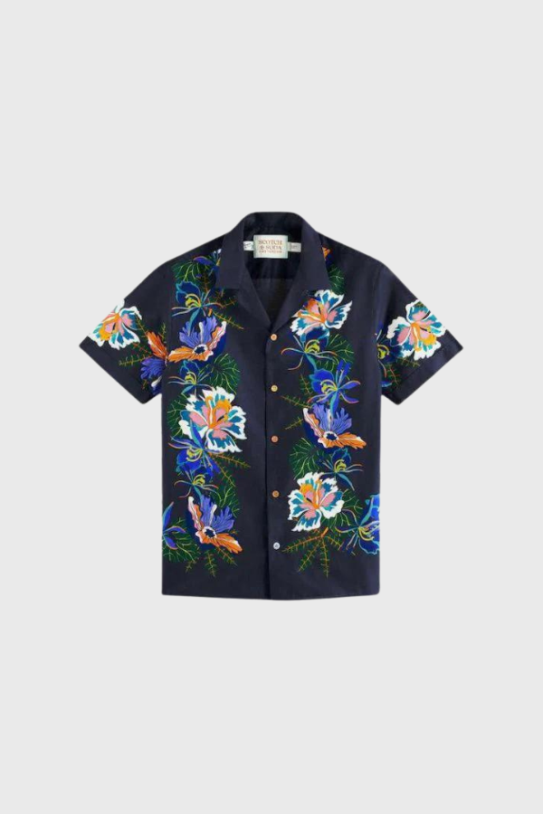 Ανδρικό πουκάμισο της εταιρίας Scotch & Soda σε μαύρο χρώμα με κοντό μανίκι και floral print.