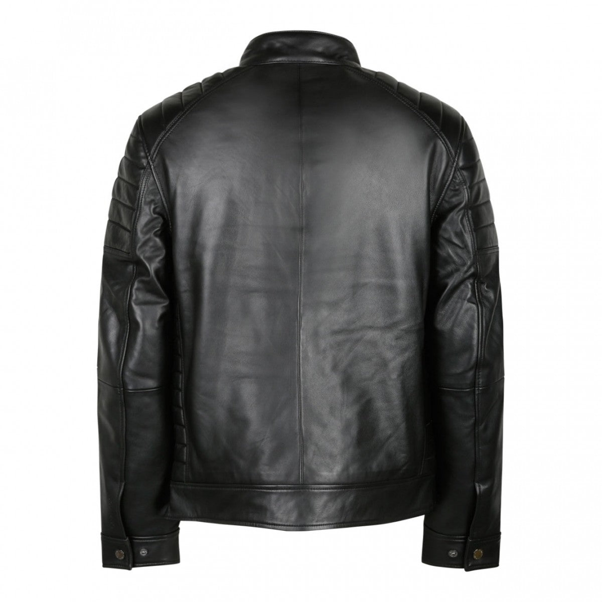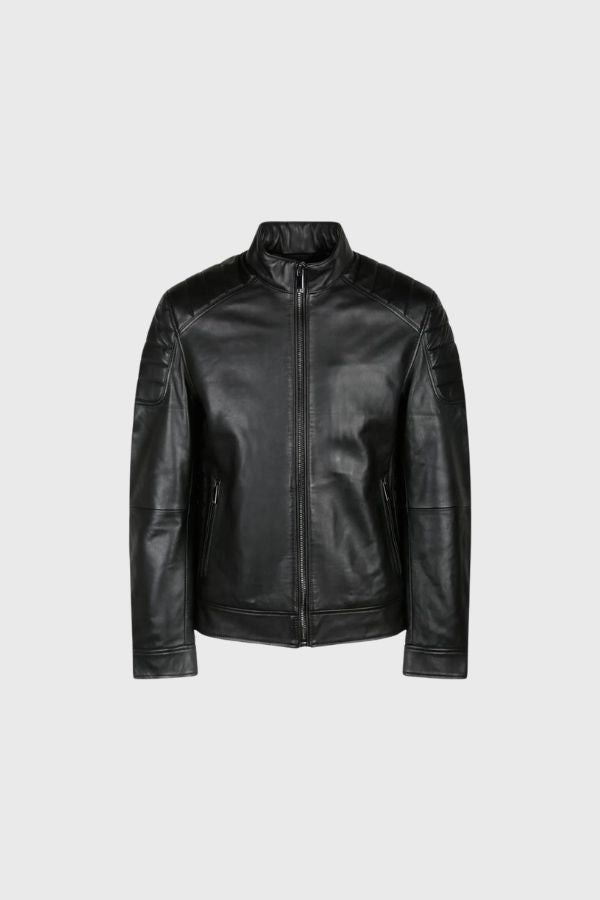 Μαύρο δερμάτινο μπουφάν, ψηλή λαιμόκοψη, κλείσιμο με φερμουάρ μπροστά, δύο πλαϊνές τσέπες με φερμουάρ, ενισχυμένα πάνελ, μακριά μανίκια και ίσιο στρίφωμα.