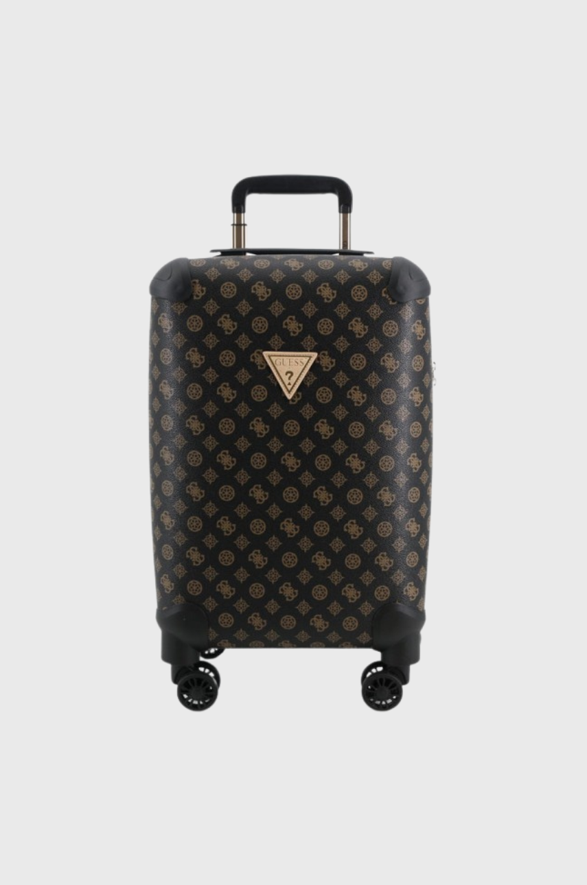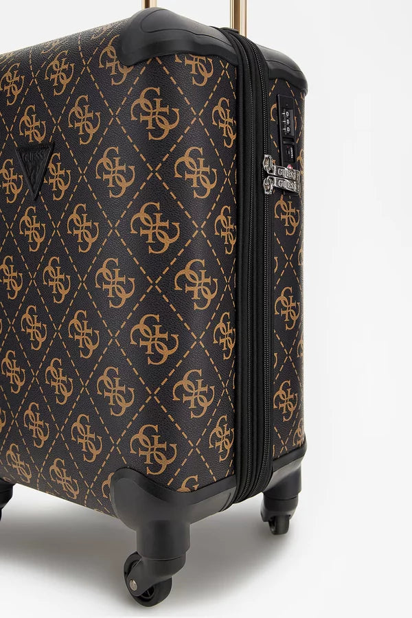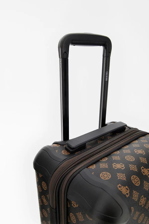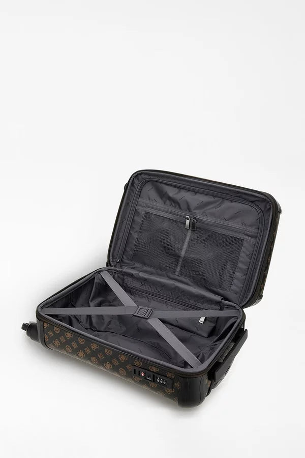Βαλίτσα τρόλει GUESS σε καφέ σκούρο χρώμα, με μπεζ allover logo και μαύρα πλαστικά. Διαθέτει λαβή χειρός και πτυσσόμενη λαβή. Κλείνει με φερμουάρ στο οποίο μπορεί να τοποθετηθεί μικρό λουκέτο. Η κυρίως θέση διαθέτει χιαστί ελαστικό ιμάντα για να συγκρατεί το περιεχόμενο στον μισό χώρο της βαλίτσας και διαχωριστικό με φερμουάρ για τον άλλον μισό χώρο. Εσωτερικά έχει 1 τσέπη με φερμουάρ και 2 mesh τσέπες με φερμουάρ. Επιπλέον διαθέτει επέκταση χωρητικότητας με φερμουάρ και ειδική κλειδαριά YiF TSA007, με κωδικό και κουμπί απελευθέρωσης στην οποία ασφαλίζονται τα φερμουάρ της κυρίως θέσης. Διαστάσεις: 32x46x22cm.
