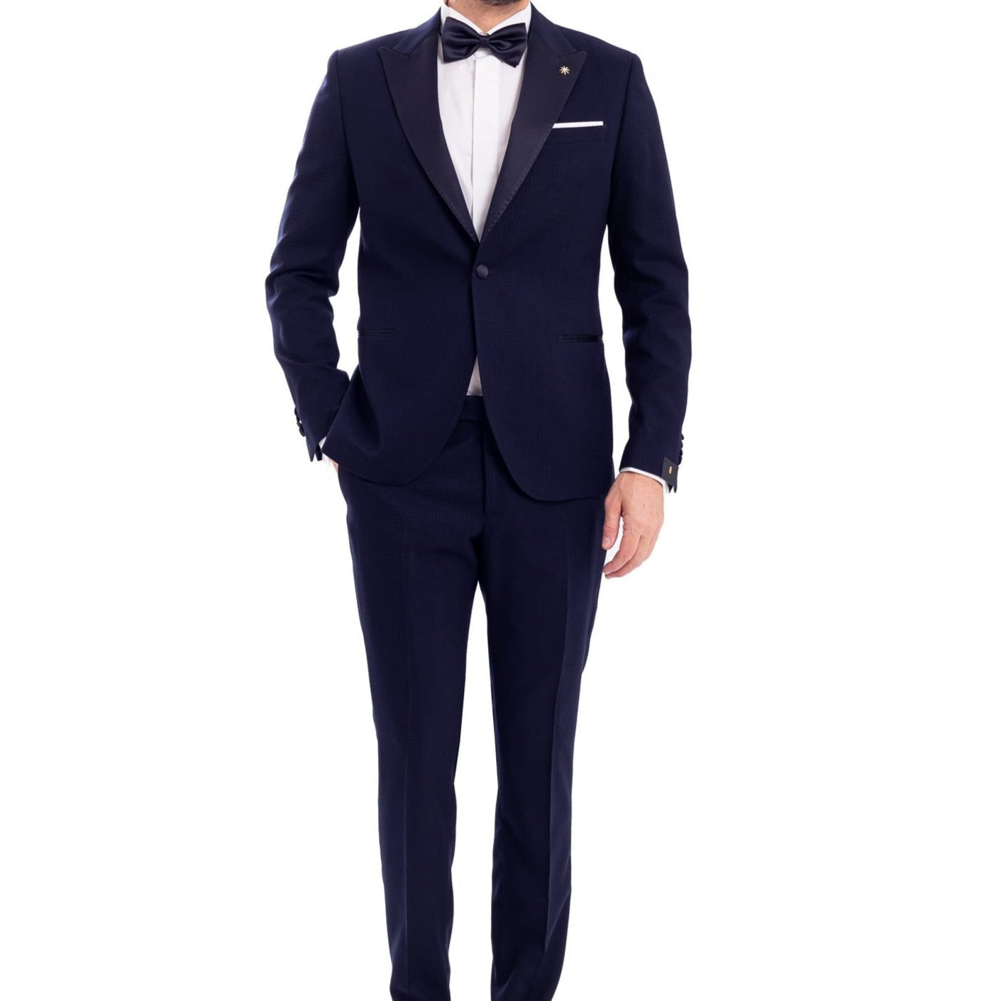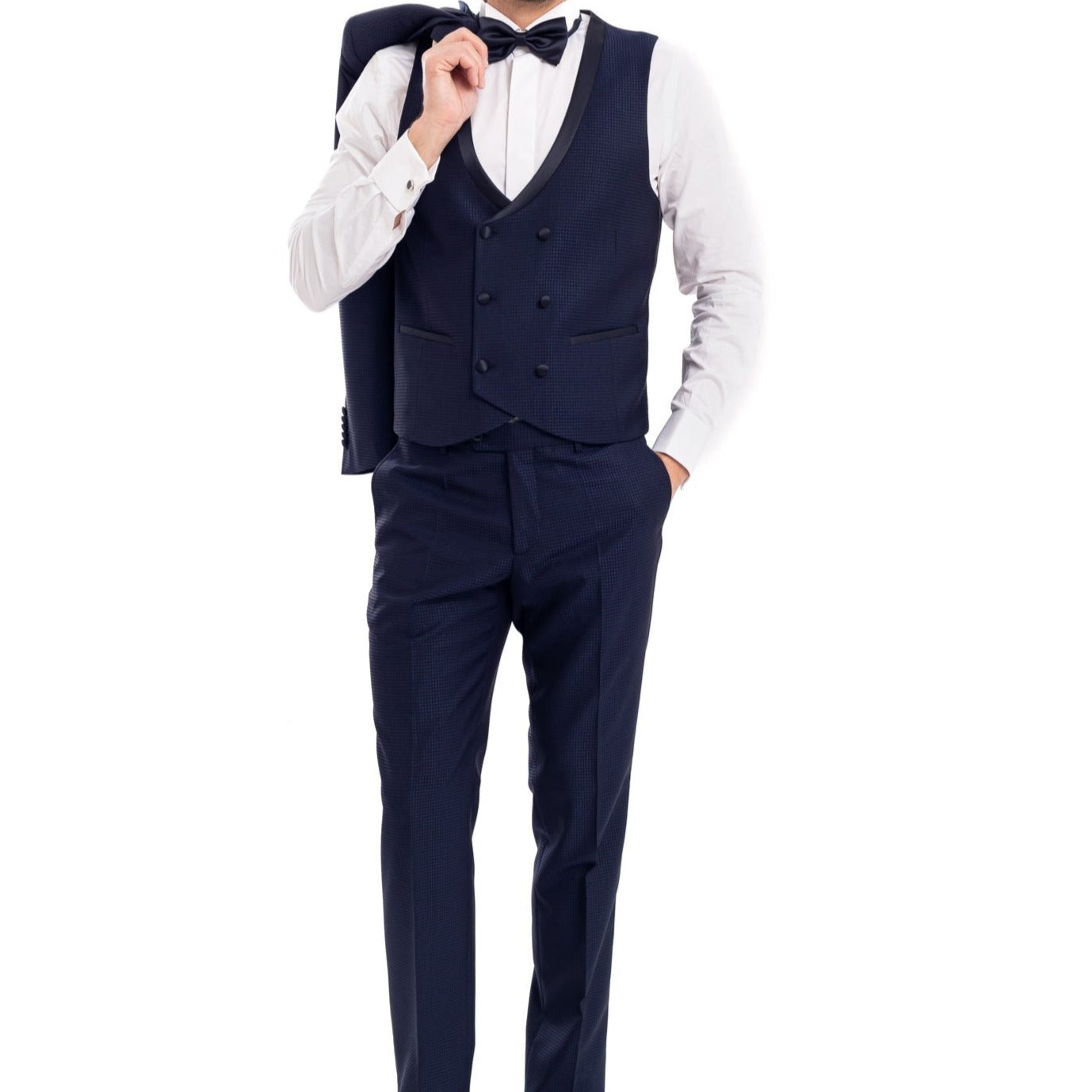 Ανδρικό κοστούμι Σμόκιν με γιλέκο, σε στενή γραμμή της εταιρίας MANUEL RITZ. Ανήκει στην premium συλλογή της εταιρίας και είναι κατασκευασμένο από ύφασμα υψηλής ποιότητας με ανάγλυφο μικροσχέδιο.