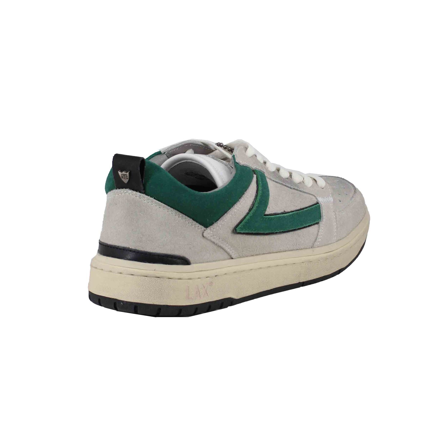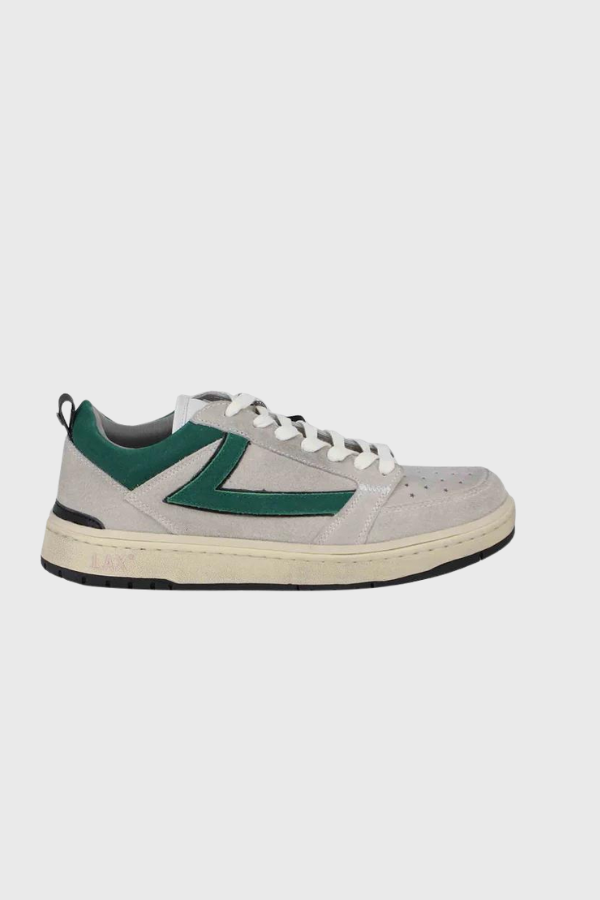 Γνήσιο σουέτ αθλητικό παπούτσι σε γκρι χρώμα με πράσινες λεπτομέρειες, δέσιμο με κορδόνια σε λευκό χρώμα, μοτίβο αστέρι στο μπροστινό μέρος, λογότυπο στη γλώσσα, σόλα με εφέ σε αντίθεση με το χρώμα, δερμάτινη εσωτερική σόλα, επένδυση στον αστράγαλο με μαξιλαράκι.