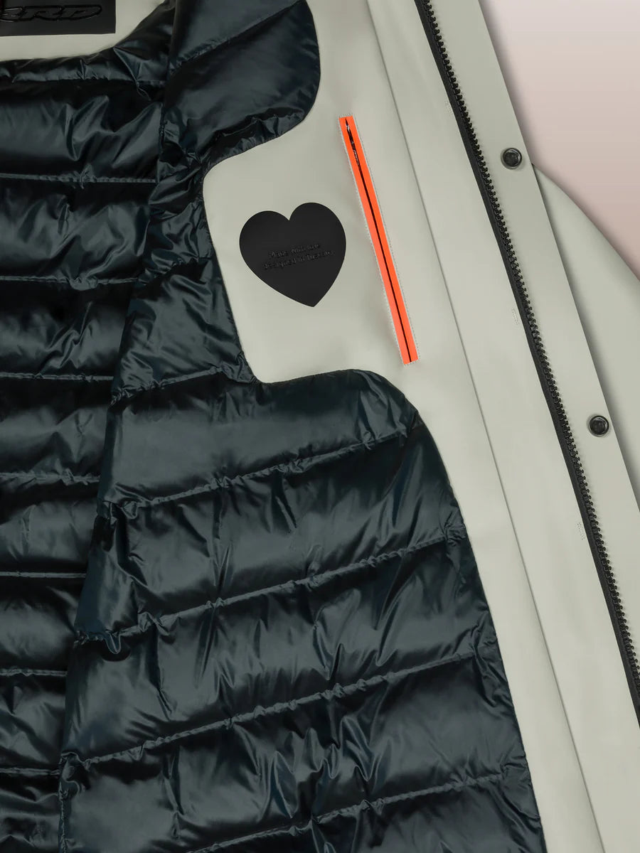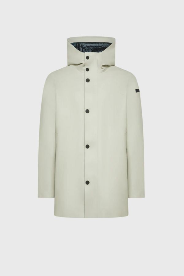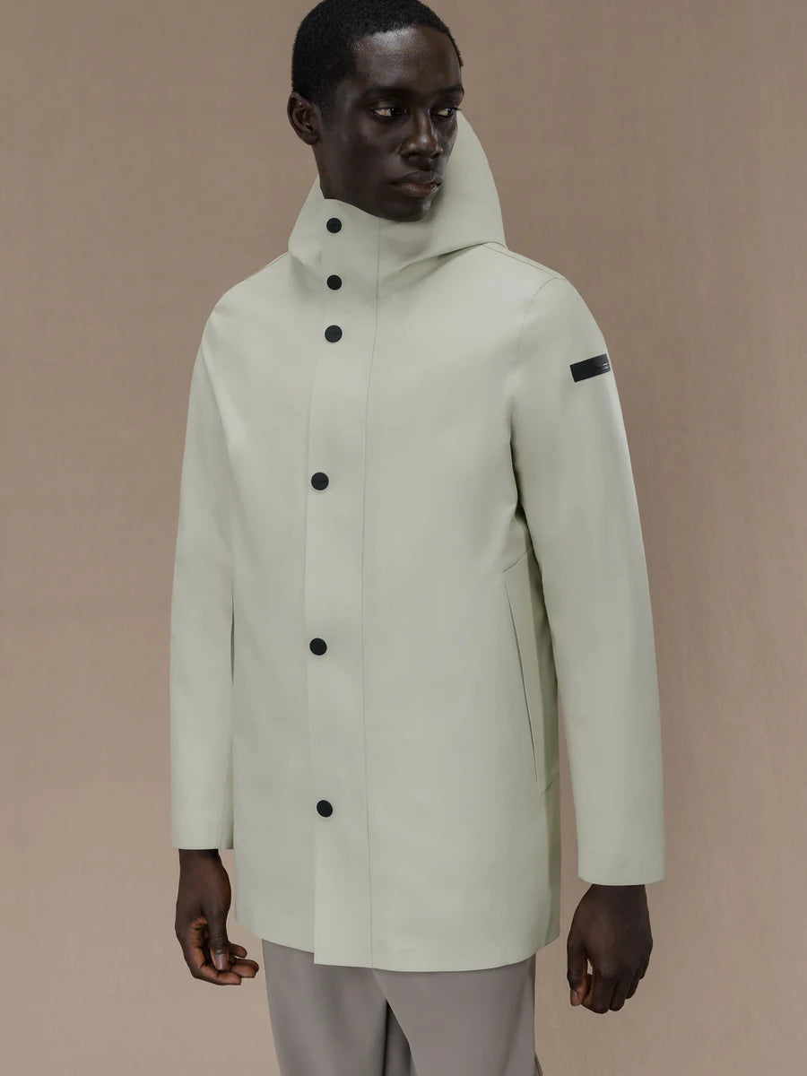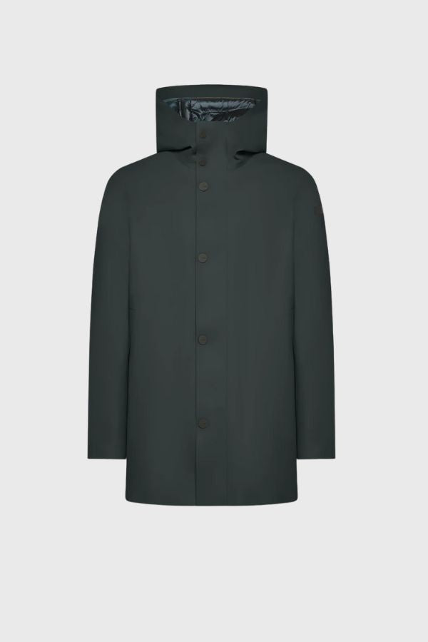 Ένα μπουφάν με άψογη εφαρμογή και εκλεπτυσμένη, hi-tech κατασκευή, που κρύβεται από τον εξωτερικό σχεδιασμό. Η αδιάβροχη, αντιανεμική και διαπνέουσα μεμβράνη Stratofabric#3 διαθέτει εξωτερική επένδυση από καουτσούκ με ματ εμφάνιση και ευχάριστα μαλακή αφή. Τα σωληνωτά κανάλια της γέμισης από πούπουλο πάπιας 90/10 διαθέτουν το καινοτόμο σύστημα Floating Shield, επίσης χωρίς ορατές ραφές, το οποίο συνδυάζει την άνεση με την ευθεία και στενή εφαρμογή. Τα πλαϊνά ανοίγματα με τζετ παρέχουν πρόσβαση στις μεγάλες εσωτερικές τσέπες.